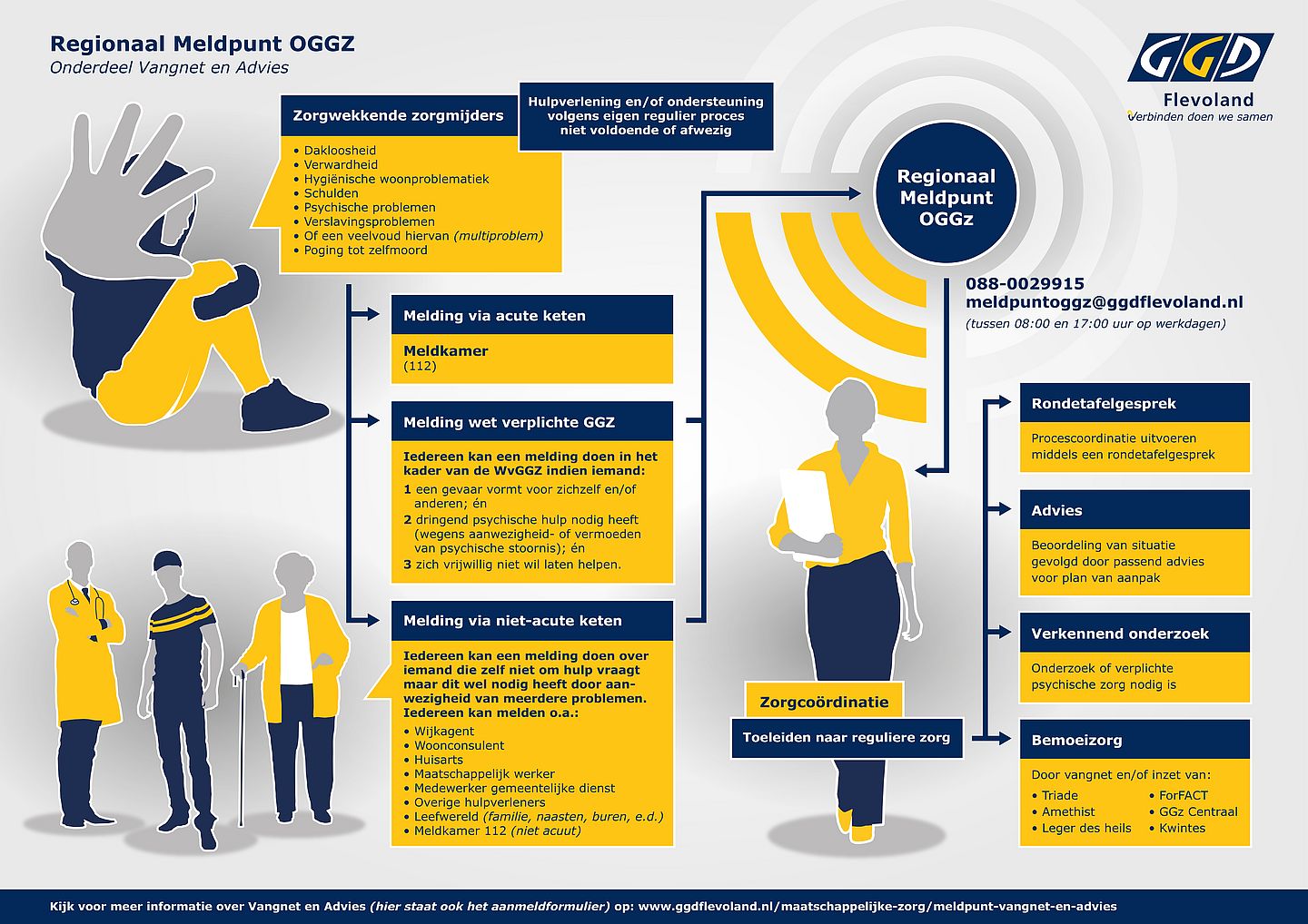Het melden voor de Wet Verplichte GGZ kan door het Aanmeldformulier Wet Verplichte GGZ in te vullen en te mailen naar: meldpuntoggz@ggdflevoland.nl. Download het formulier op de website van de ggdflevoland.